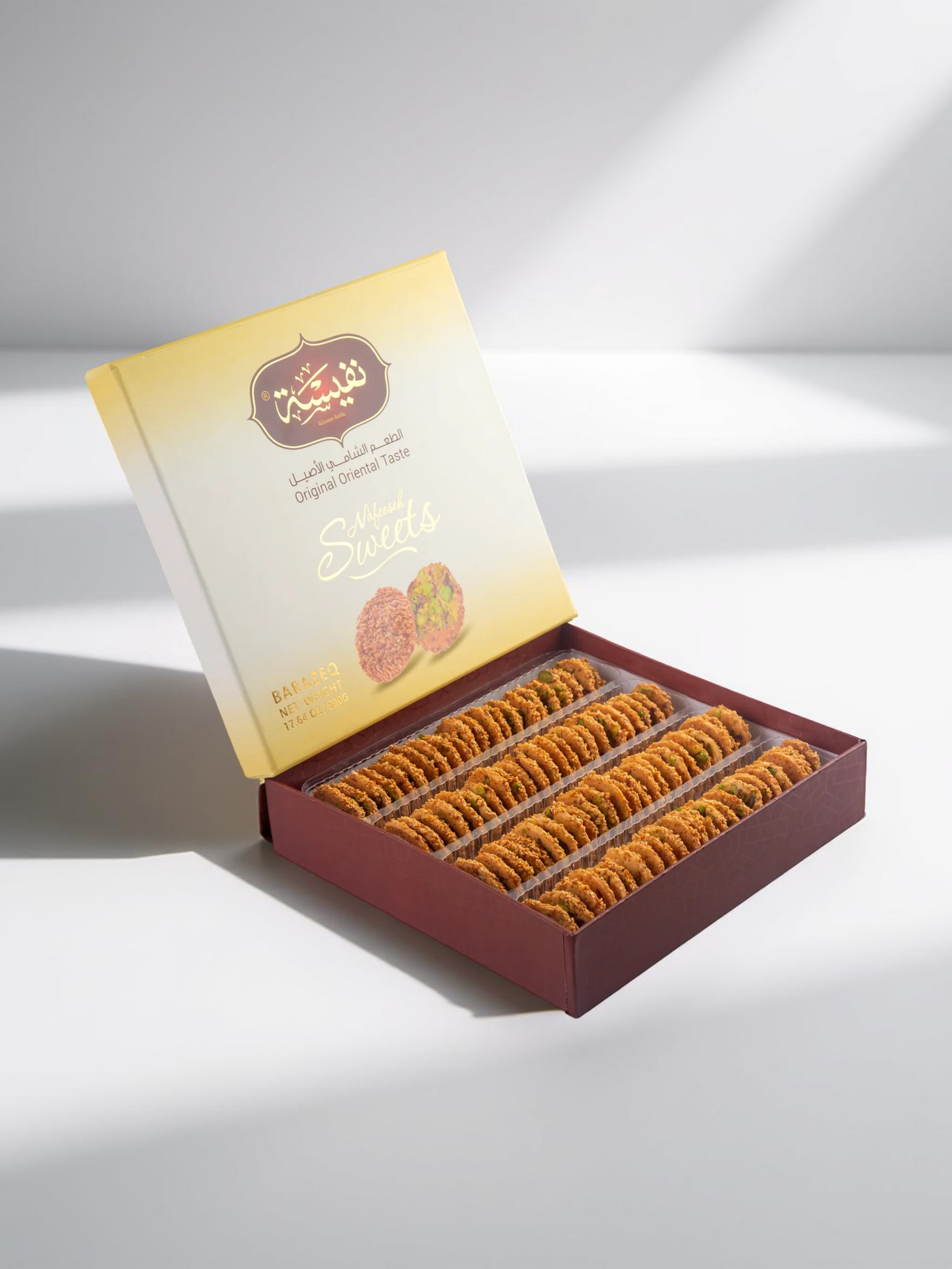 Irresistible sesame and pistachio biscuits are made with the finest quality ingredients. Comes in a luxuriously packaged (500 g and 900) g box, making a perfect gift for all occasions or a treat just for you. Our pastry chefs are dedicated to creating the ideal middle eastern treats for your enjoyment.