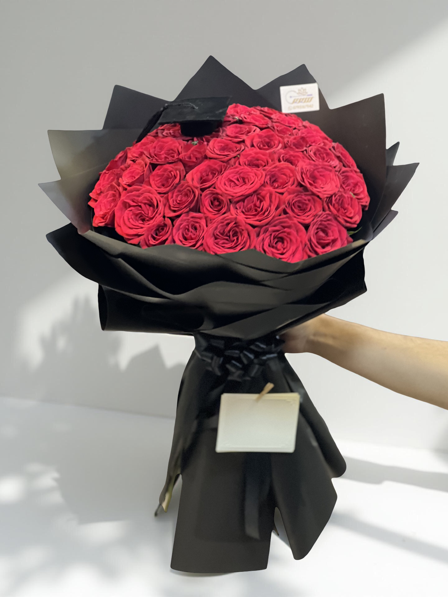 A bouquet full of elegance and sophistication, featuring distinctive red roses expertly arranged in a perfect circular shape and wrapped in luxurious black paper that highlights the blooms' beauty.
