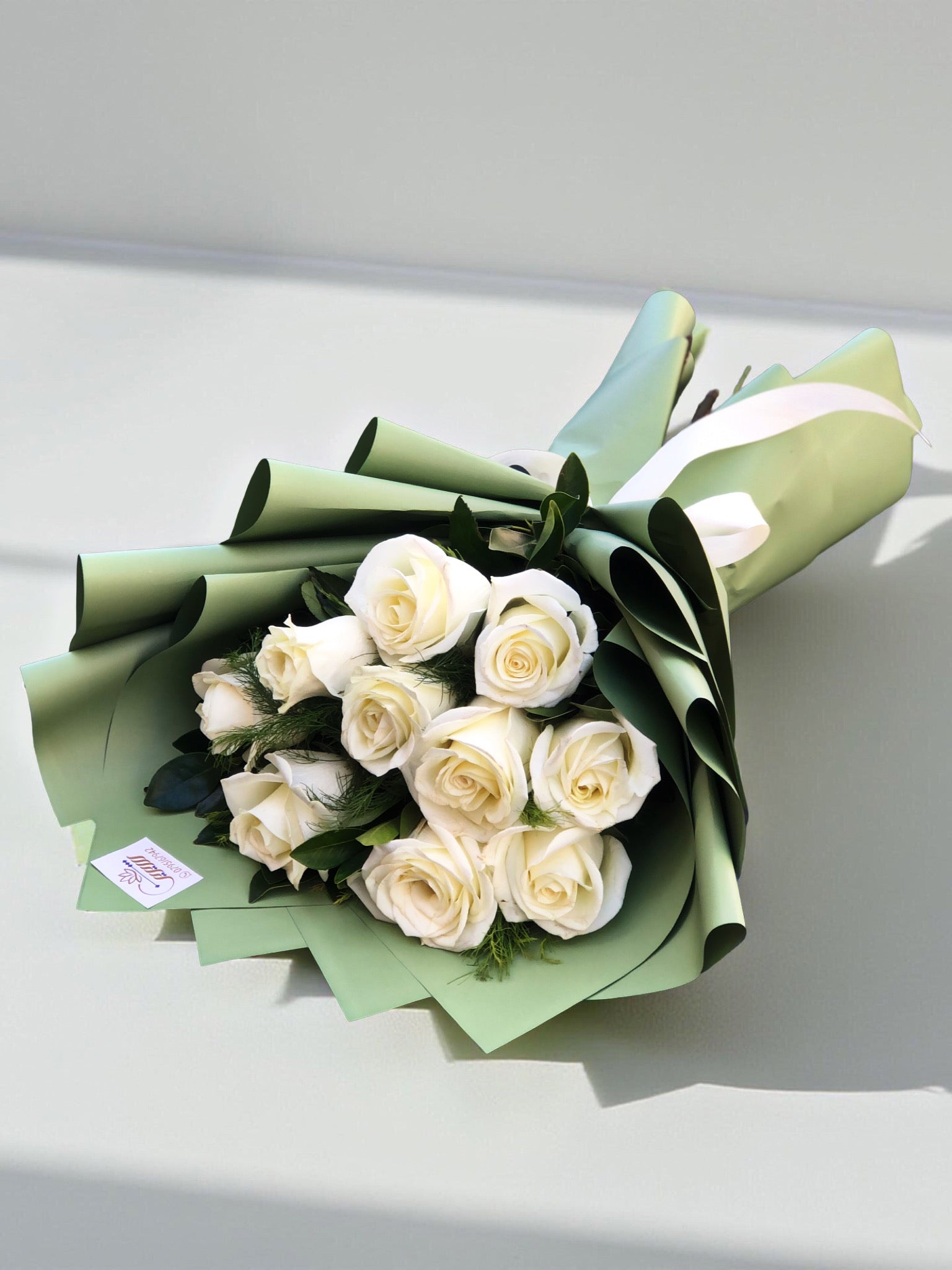 A refined hand bouquet featuring pure white roses wrapped in a distinctive green-toned paper that adds a fresh, elegant touch. A timeless design that speaks of purity, grace, and natural charm. Available in three sizes: