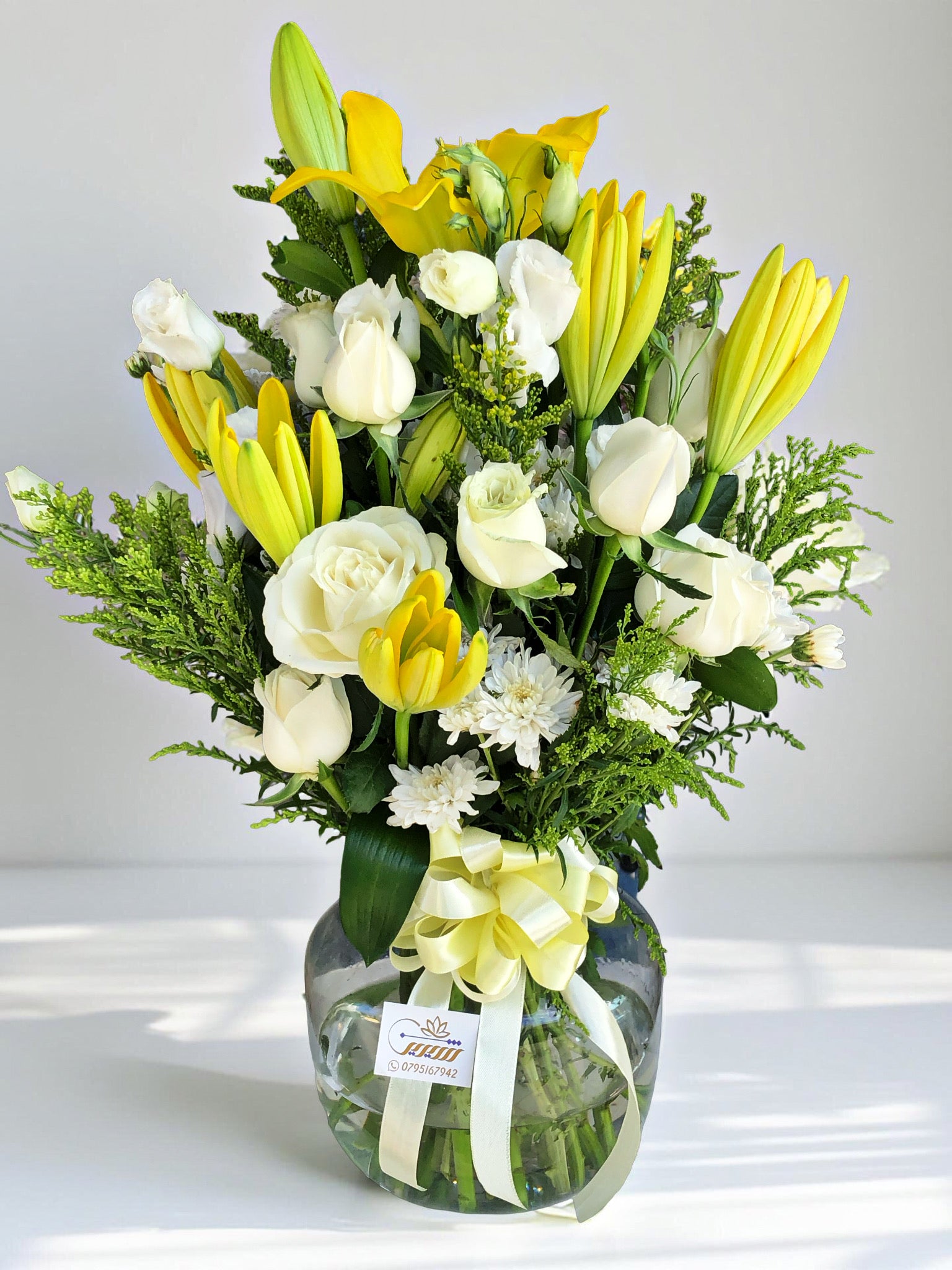 A lavish floral arrangement designed to impress, featuring a refined mix of vibrant yellow lilies, pristine white roses, classic chrysanthemums, and hand-picked seasonal blooms — all gracefully set in a luxurious glass vase that speaks elegance from every angle. Golden Grace is a radiant celebration of beauty, warmth, and timeless sophistication.🌾