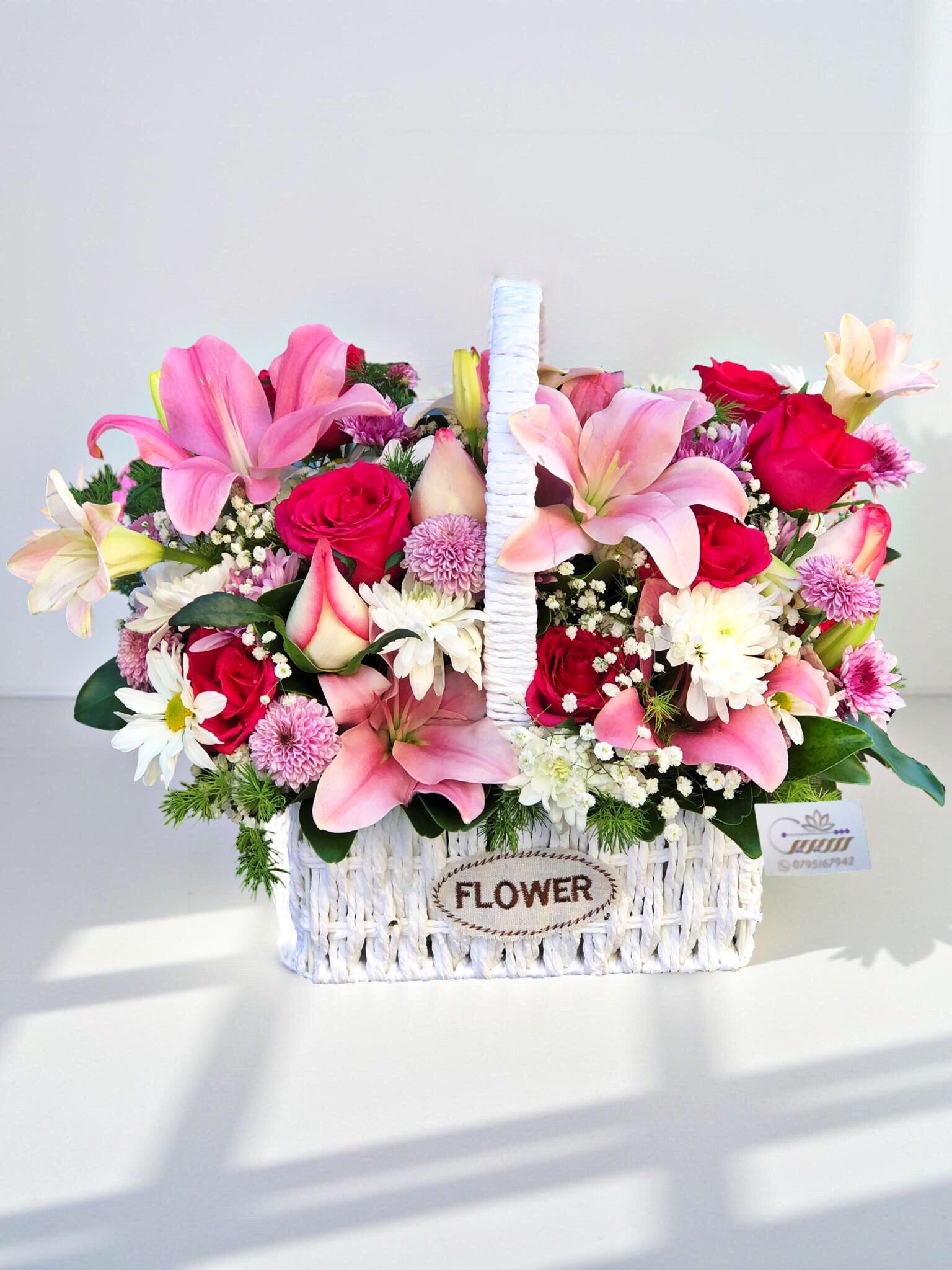 A charming floral arrangement full of elegance and vibrant energy, featuring a delightful mix of pink lilies, fuchsia roses, chrysanthemums, and other seasonal blooms. Thoughtfully designed in a stylish white straw basket, Pink Symphony brings a burst of color and sophistication — perfect for joyful occasions and heartfelt moments.