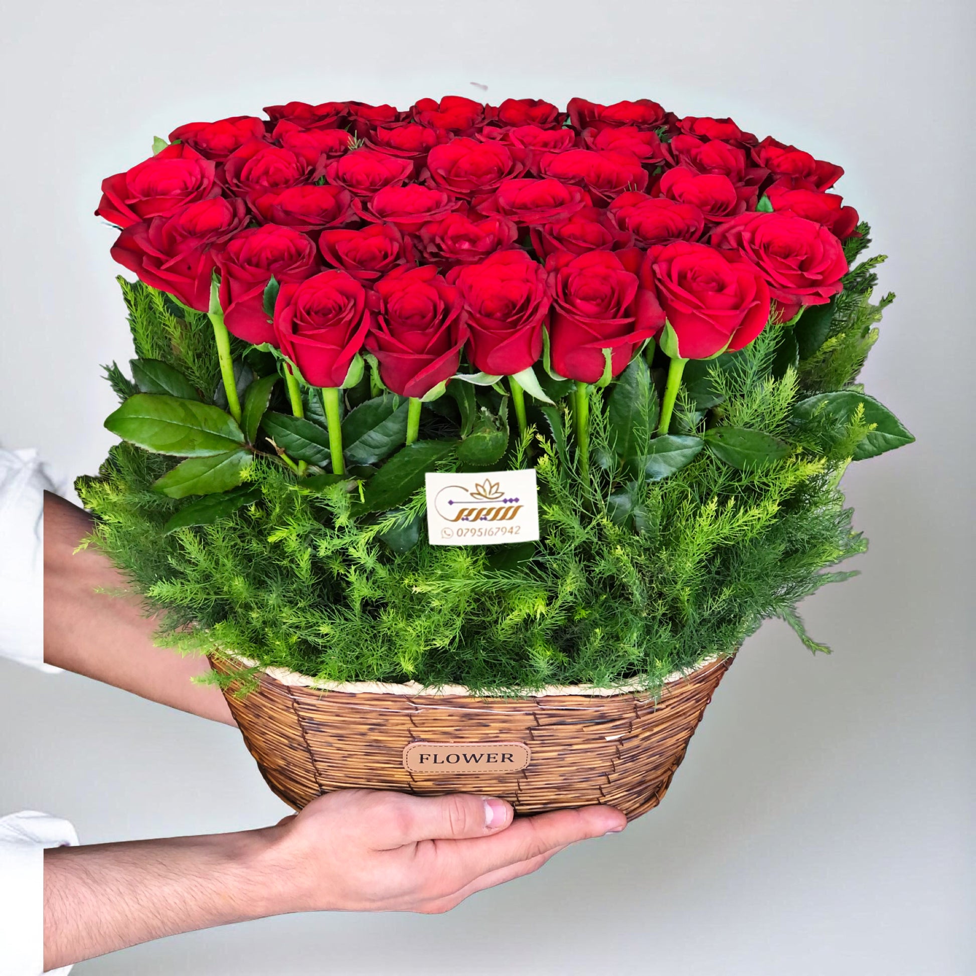 A stunning floral masterpiece overflowing with deep red roses, beautifully arranged in a natural straw basket. Designed with 35 to 40 premium roses to create a full, luxurious look that radiates warmth, elegance, and timeless romance. Scarlet Bloom is more than a bouquet — it’s a statement of passion crafted in nature’s embrace.