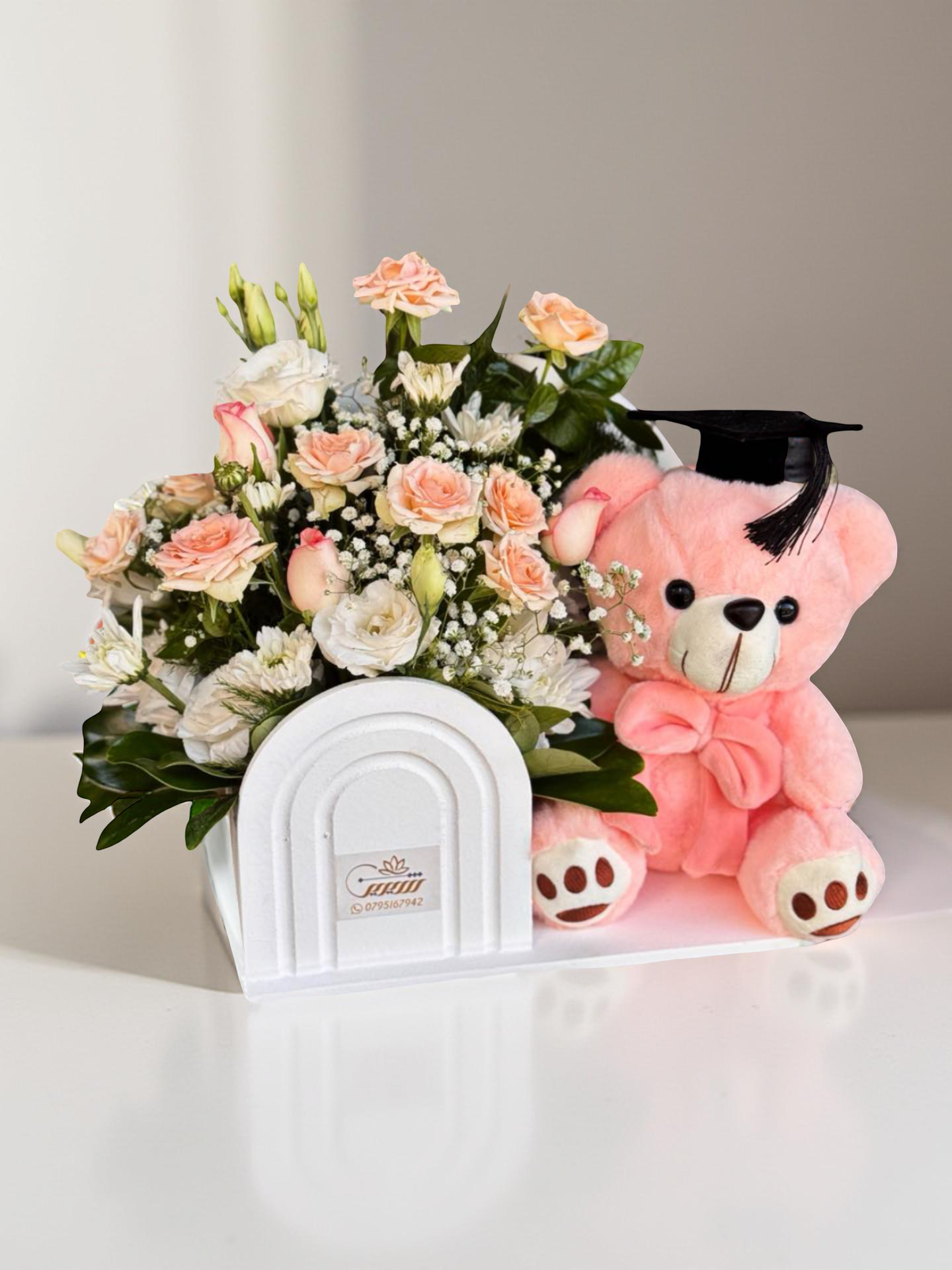 A unique floral backdrop arrangement set on a white wooden stand, featuring delicate pink Baby Roses and white Louisiana flowers. On the opposite side, a charming pink graduation teddy bear is attached, creating the perfect balance of elegance and cuteness.