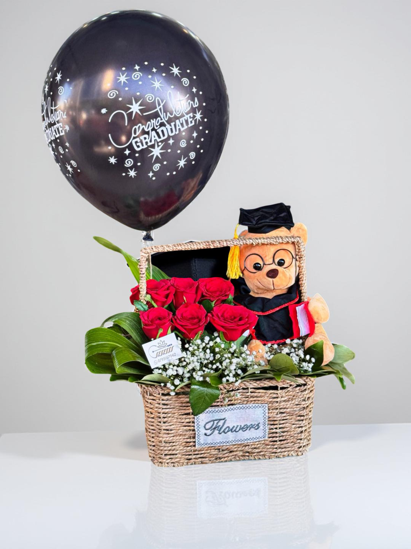 A unique arrangement designed in a natural wicker basket, featuring elegant red Roses paired with delicate white Gypsophila. On the other side, a charming graduation teddy bear is placed, with a helium graduation balloon rising from the arrangement, adding a festive and luxurious touch.