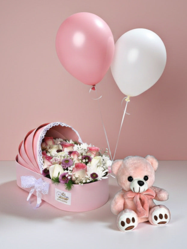 Celebrate her grand entrance with a gift as sweet and beautiful as she is. The "The Lady Arrives" package is a perfect blend of floral art and cuddly surprises.