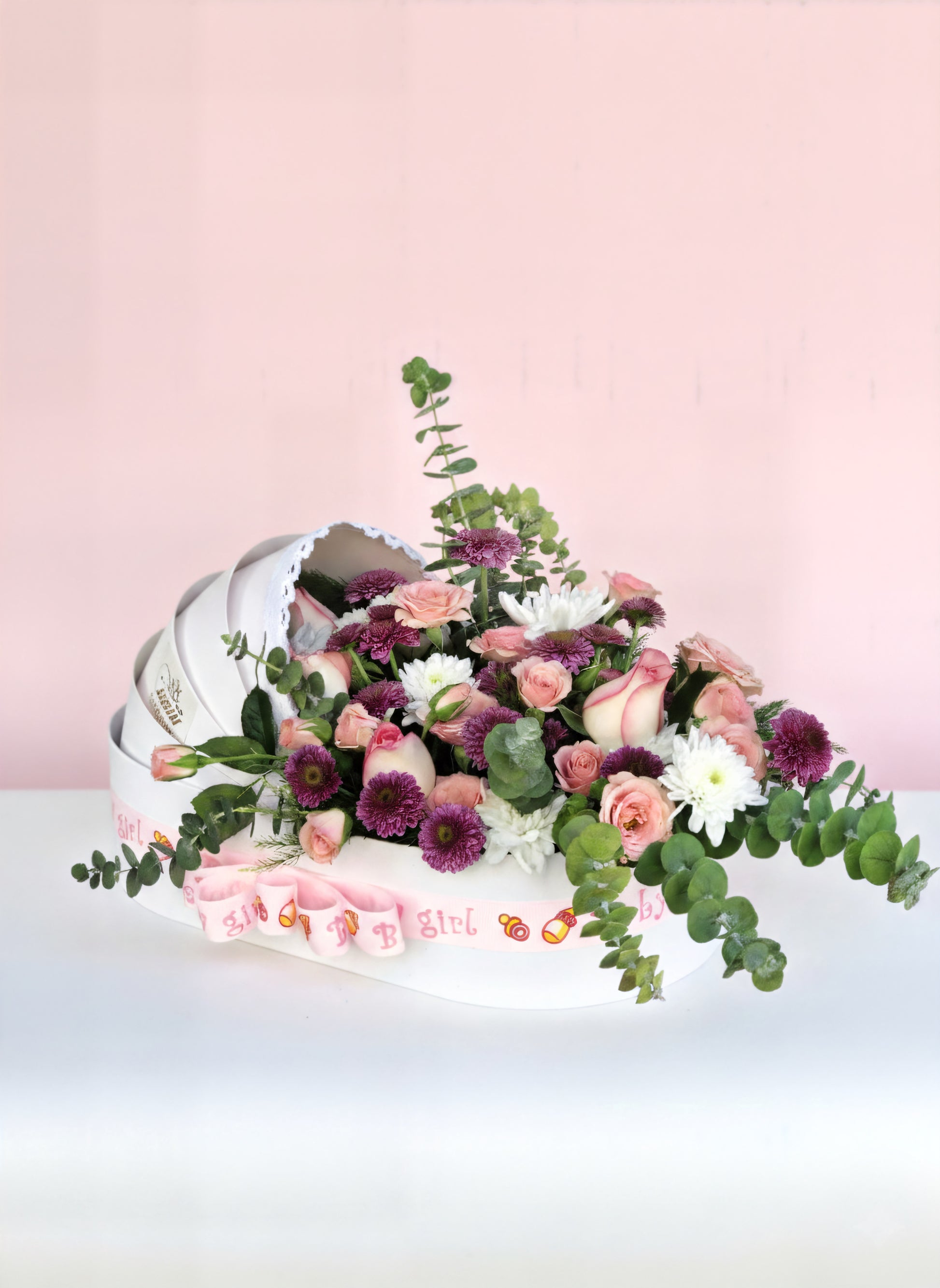 Celebrate her grand entrance with a vibrant splash of color. This lovely arrangement is presented in a crisp white carriage box, highlighted by a sweet pink ribbon dedicated to the new baby girl. The flowers are a joyful mix of blush pink roses, deep purple mums, and snowy white blooms, all framed by wild, aromatic eucalyptus branches. A truly heartwarming gift that brings the beauty of a garden indoors.