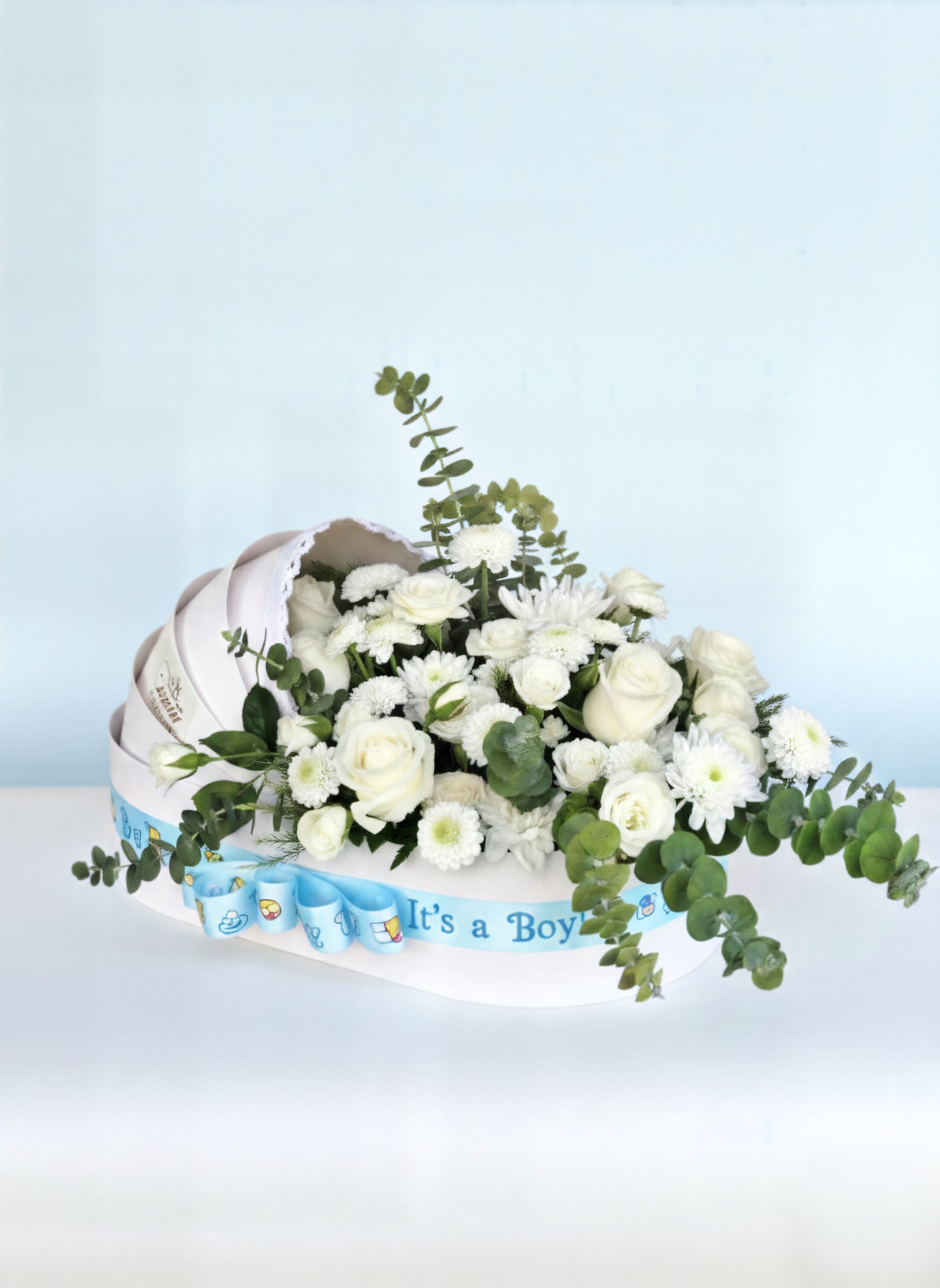 Announce the arrival of the new baby boy with style and freshness. This pristine white carriage box is wrapped in a charming "It's a Boy" blue ribbon, setting the tone for celebration. The arrangement features a lush gathering of creamy white roses and chrysanthemums, accented with cascading stems of fresh eucalyptus greenery for a modern, garden-style look. It is a timeless gift that radiates joy and purity.
